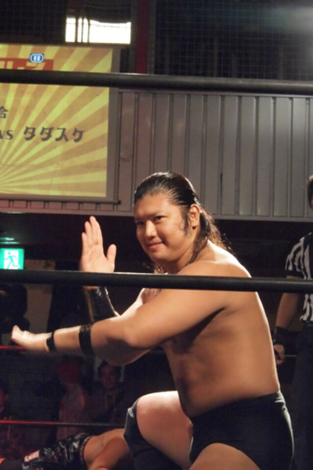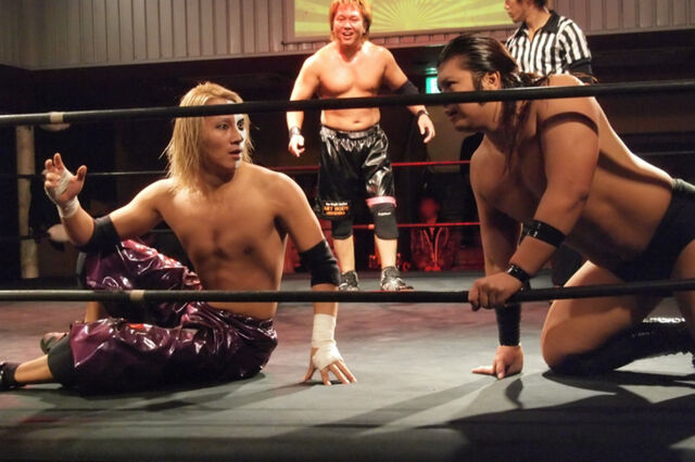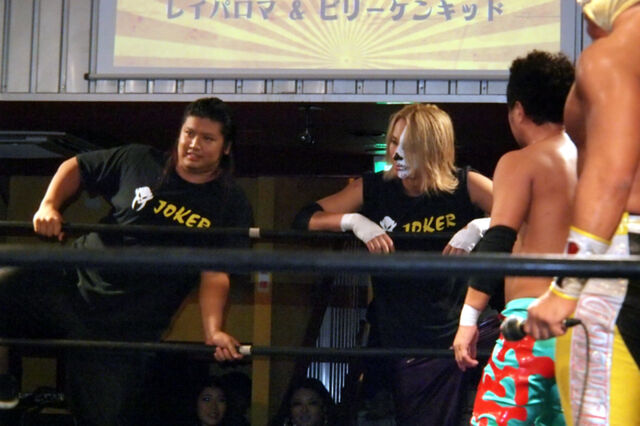 Tadasuke and HAYATA in JOKER T-shirts come to the ring after Kabuki Kid declares a one day open tournament for the tag titles